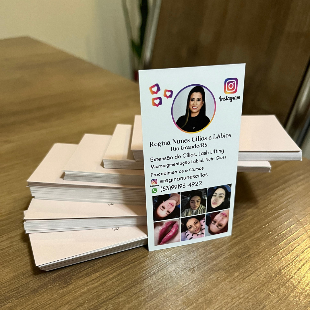 Cartão de visitas frente colorida e verso em branco, em papel couchê 250g e acabamento em verniz na frente. 1000 unidades.